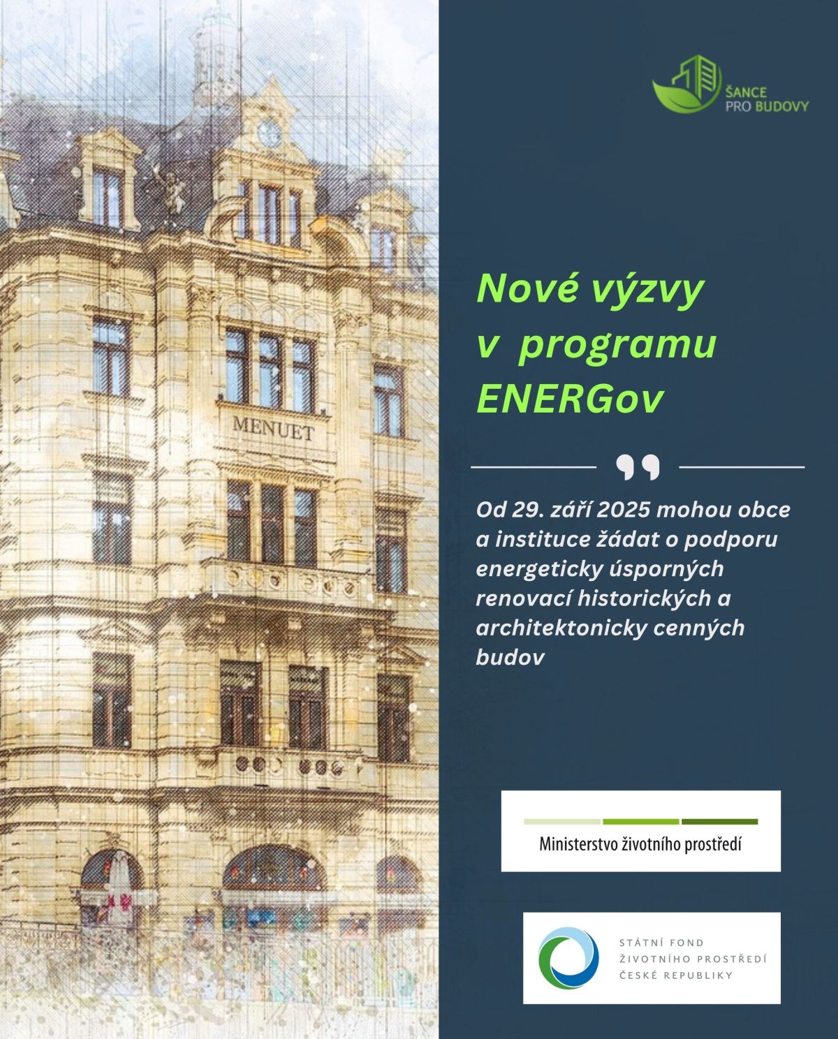 Ministerstvo životního prostředí vyhlásilo novou výzvu programu ENERGov, která zahrnuje i historicky a architektonicky cenné veřejné budovy do potřebné obnovy a energeticky úsporných renovací. Celkem je pro tuto výzvu vyčleněno 500 milionů korun a o dotace mohou veřejné a neziskové instituce žádat od 29. září 2025 do 30. dubna 2026. Více informací k výzvě a podmínkám podání žádostí naleznete ZDE.