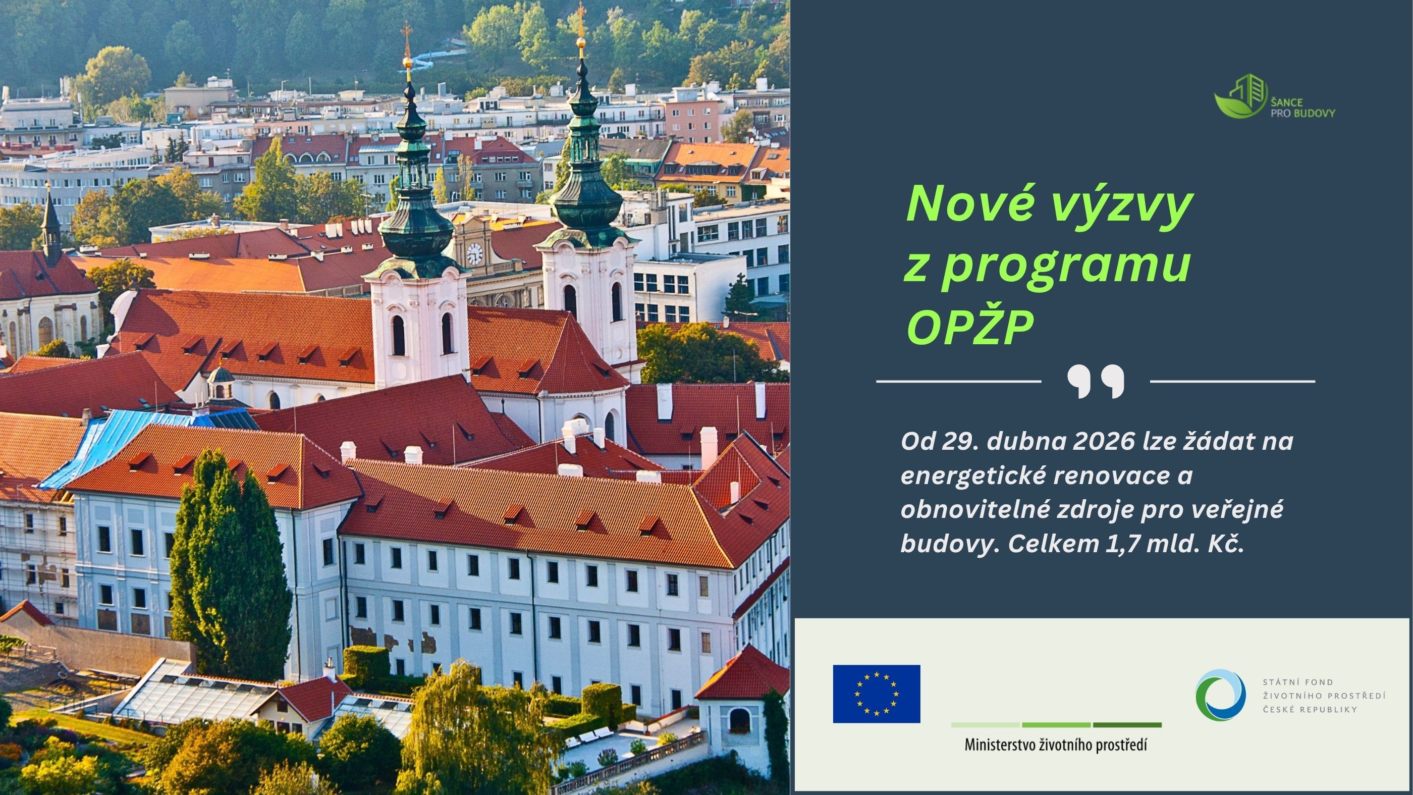 Dne 26. března 2026 zveřejnily Ministerstvo životního prostředí a Státní fond životního prostředí ČR tiskovou zprávu k novým výzvám z Operačního programu Životní prostředí 2021–2027. Na energeticky úsporné renovace a instalace obnovitelných zdrojů energie ve veřejných budovách je v nich připraveno celkem 1,7 miliardy korun. Příjem žádostí se podle zveřejněných podmínek otevře 29. dubna 2026.